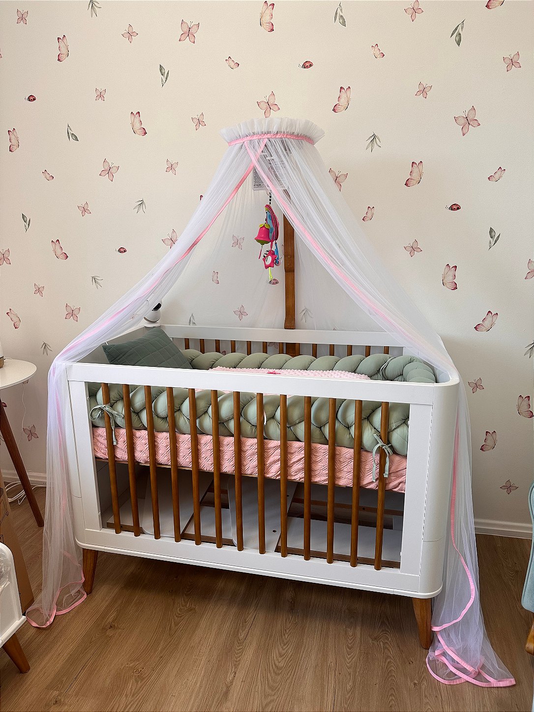 O mosquiteiro é confeccionado em tecido leve com trama delicada para garantir proteção e circulação de ar. O suporte disponível em diversas cores de madeira e pintura branca facilita a instalação na lateral do berço sem danificar o móvel, mantendo o mosquiteiro fixo com segurança enquanto o bebê repousa.